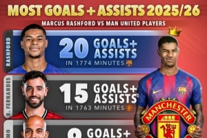 24直播网01月24日讯 据Score90统计,拉什福德本赛季以20粒参与进球成为队内射手王,出场1774分钟。他的进球数领先于B费的15球、姆伯莫的9球等队友,展现了高效的进攻能力。