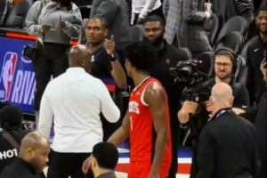 赛后,阿门·汤普森和奥萨尔·汤普森两兄弟聊天,聊完还相互指着对方。