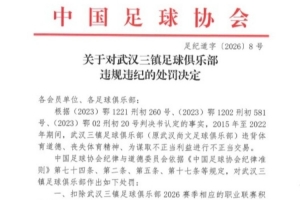 24直播网01月29日讯 中国足协对武汉三镇俱乐部“假赌黑”行为开出罚单:扣除其2026赛季联赛积分5分,并罚款80万元。此举旨在警示各俱乐部,抵制不正当利益,坚守法律与职业道德,共同推动中国足球健康发展。