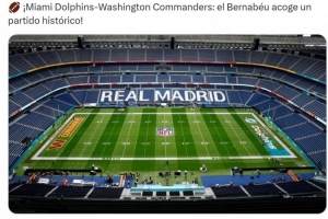 皇马官方社媒晒出伯纳乌球场准备就绪的照片,配文:“迈阿密海豚vs华盛顿指挥官,伯纳乌球场将迎来一场历史性的比赛。”