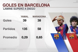 据ESPN统计,18岁亚马尔已经为巴萨打进39球,巴萨生涯进球数量超越马拉多纳(38球)。