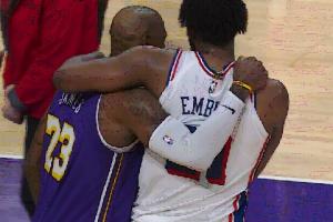 里夫斯冲过来和八村塁相拥~!!!詹姆斯和恩比德也抱在一起~!!!