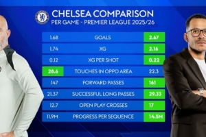 24直播网02月07日讯 天空体育对比切尔西主帅马雷斯卡与罗塞尼尔的数据。罗塞尼尔带队在进球(2.67 vs 1.68)、预期进球及射门效率上更优,进攻更犀利。但马雷斯卡在控场和推进上占优,控球序列推进距离更长(14.5米 vs 11.9米),向前传球也更积极。