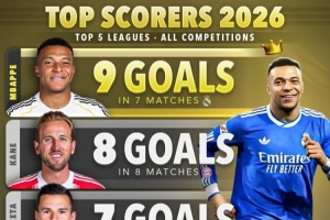 24直播网02月10日讯 Score90统计了2026年五大联赛球员进球榜。皇马的姆巴佩以7场9球高居榜首,拜仁的凯恩8场8球紧随其后。毕巴的古鲁泽塔、马赛的格林伍德和巴萨的亚马尔分列三至五位,进球数分别为7球、7球和6球。