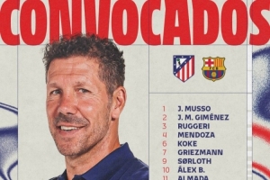 24直播网02月12日讯 马竞公布国王杯半决赛首战巴萨大名单,门将奥布拉克领衔。卡尔多索、巴里奥斯缺席。格列兹曼、瑟尔洛特等主力在列,西蒙尼之子入选,球队将主场迎战巴萨。